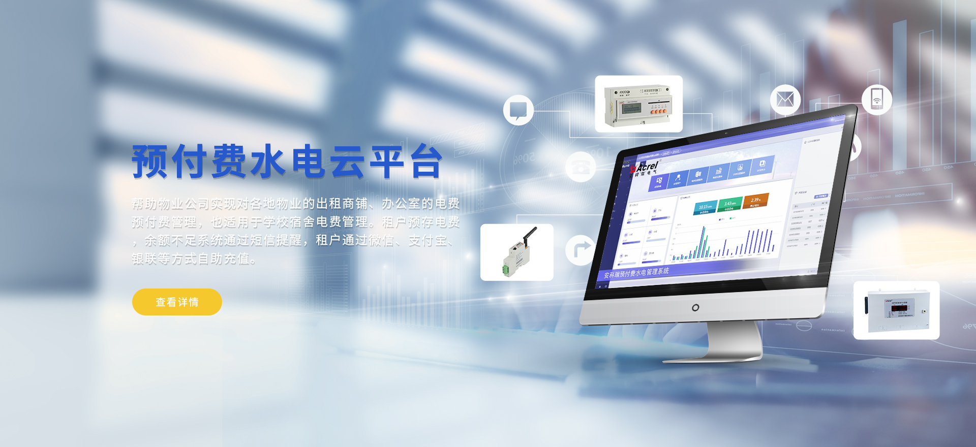 安科瑞提供的解決方案包括Acrel-EIoT能源物聯網云平臺變電所運維云平臺安全用電管理云平臺環保用電監管云平臺智慧消防云平臺能源管理云平臺、工業企業能源管控平臺、遠程預付費云平臺餐飲油煙監管云平臺電動汽車/電瓶車充電樁收費管理云平臺、電力監控/無線測溫系統、電能質量治理系統、電氣火災監控系統消防設備電源監控系統防火門監控系統應急照明和疏散指示系統、智能照明控制系統、醫用隔離電源絕緣監測系統等,幫助用戶實現能源智能化、可視化、精細化管理,提高用能效率和用能安全,為企業節能降耗和實現能源數字化建設提供數據服務。